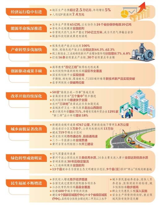 “十四五”时期是我省发展历程中极不寻常、极不平凡的五年。在省委坚强领导下,全省上下坚持以习近平新时代中国特色社会主义思想为指导,认真贯彻习近平总书记对山西工作的重要讲话重要指示精神,坚决贯彻党中央、国务院决策部署,克服新冠肺炎疫情、能源市场波动和经济下行压力加大等困难挑战,坚定不移推动高质量发展、深化全方位转型,“十四五”规划主要目标任务基本完成,各项事业发展取得新进步新成就,中国式现代化山西实践迈出新的坚实步伐。