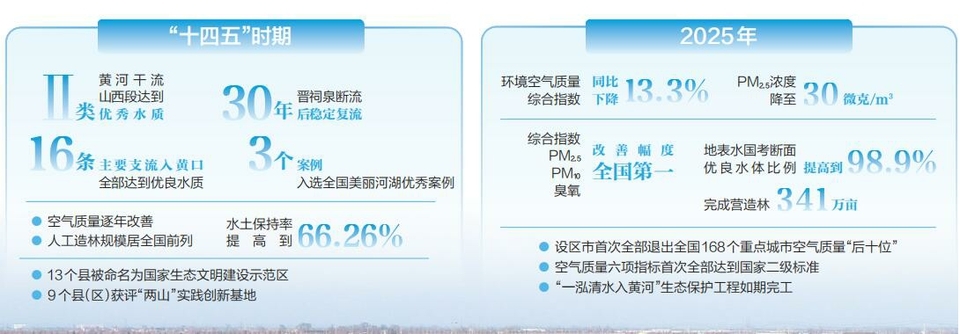 2025年,全省环境空气质量综合指数实现八年连降,优良天数比例提升至81.4%,空气质量六项指标首次全部达到国家二级标准。“一泓清水入黄河”生态保护工程如期完工,地表水国考断面优良水体比例提高到98.9%。完成营造林341万亩。生态环保多项指标创有监测记录以来最好水平,表里山河重焕美丽风采,绿水青山成为亮丽底色。