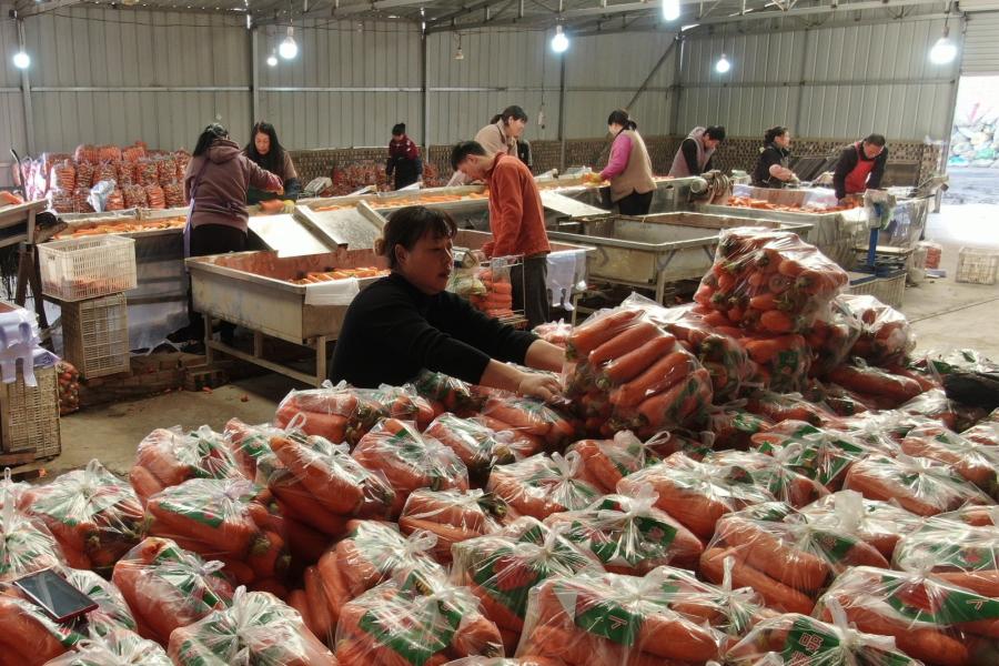 东北常村地平水浅,土质疏松,产出的胡萝卜色泽鲜艳、口感脆甜,深受市场欢迎。从地里产出的胡萝卜,直接送到村上蔬菜收购点,经过清洗、分拣、打包、称重、装车,销往河南、长沙等地区。