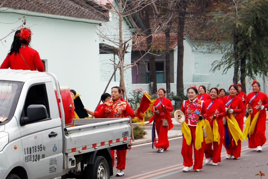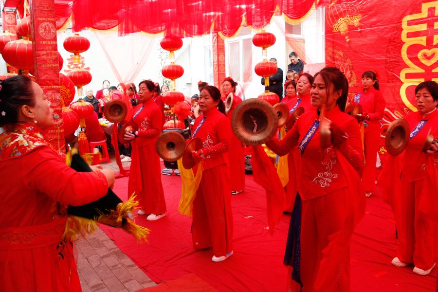 “接到主家的邀请后,我们就精心排练了锣鼓表演、舞蹈表演,今天在这里为两位新人添祝福,希望他们早生贵子,白头到老!”“木兰花”鼓乐志愿服务队队长、东郭村妇女主任任先枝说。