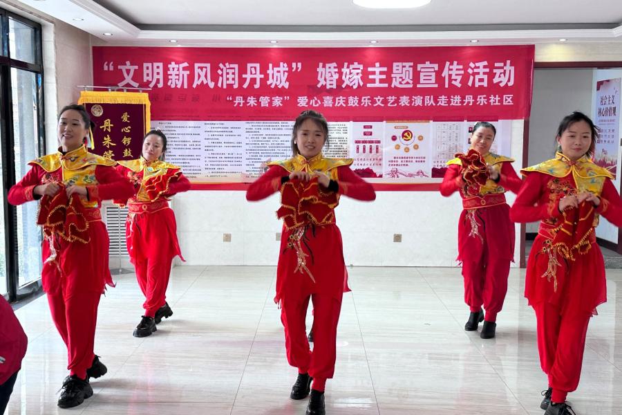 12月19日,“丹朱管家”爱心喜庆鼓乐文艺表演队走进丹乐社区开展文明婚嫁主题宣传活动。