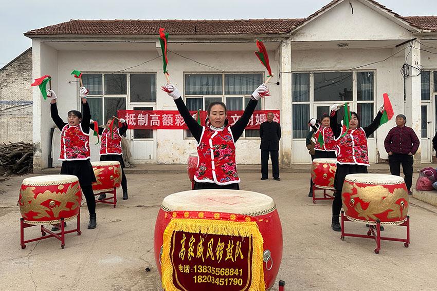 咚咚锵、咚咚锵……12月25日,在南陈镇苏村小广场,着装统一的高家威风锣鼓志愿服务队,正在开展“抵制高额彩礼 倡导文明新风”移风易俗主题宣传活动。