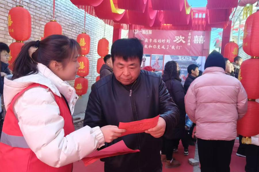 婚礼现场,鼓乐志愿服务队带来一场气氛热烈、别开生面的鼓乐表演,为传统婚礼吹进一缕清风。志愿服务队还抓住人流量大机会,发放倡议书,讲解移风易俗重要意义,倡导大家婚事新办、喜事简办,节俭文明过节。