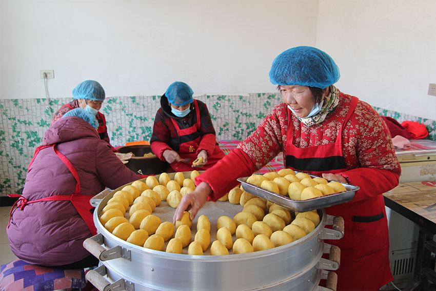 粟米团子店店主何爱萍正在和邻居们一起忙着包团子,只见她们拿起面剂子,捏成窝窝状,包入红豆馅料,团成椭圆形,不一会儿功夫,就摆满一笼屉金灿灿的团子。“以前外出打工,现在年龄大了,跟邻居们商议后,决定在家蒸团子,试了试,团子销量不错,每年从农历10月蒸到腊月二十三,大概蒸60多天,一天卖600个左右。”现年62岁的何爱萍告诉记者,从2023年冬天开始做团子,年收入3万元左右。