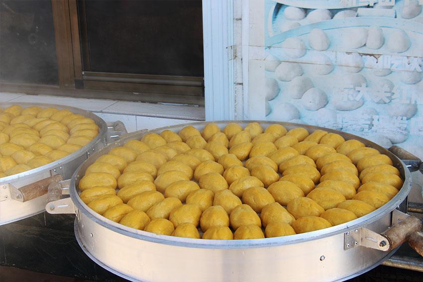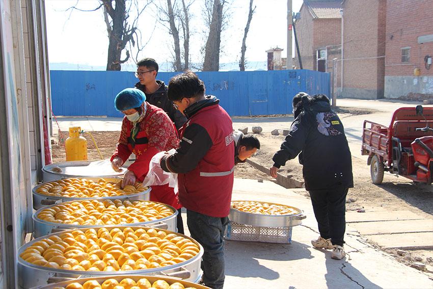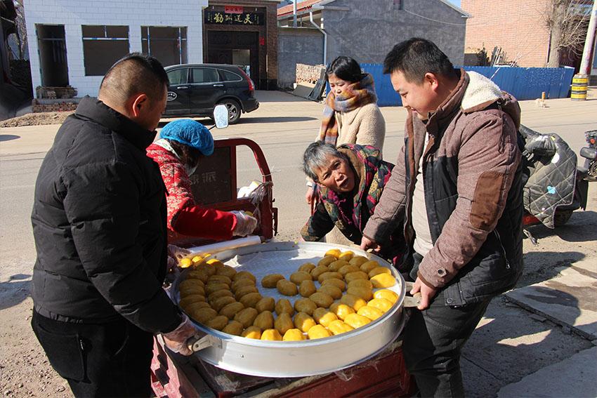 “我家老头儿特别爱吃黄蒸,一个冬天前后已经吃了300多个……”70多岁的赵大娘一边往车里摆放团子,一边对团子的美味津津乐道。1月20日,前来宋村镇东大关粟米团子店购买黄蒸的顾客络绎不绝,有的骑着三轮车,有的开着私家车,热气腾腾的黄蒸刚出锅,便被一抢而空。“她家的团子有黍米面,口感软、糯、好吃,来买了三四次了。”北李庄村村民苗狗蛋非常爱吃这儿的团子。
