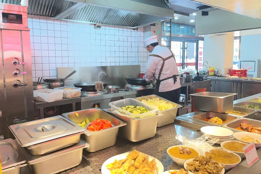 走进慈林店,可视化厨房全程公开食材加工流程,让居民看得放心、吃得安心。餐台上,热菜、凉菜分区整齐陈列,搭配清爽汤品与新鲜水果,每日菜品轮换不重样。食堂贴心配备就餐小推车与托盘,适配单人、多人就餐场景;无接触分饭机可按需提供白米、糙米两种主食。针对老年人、儿童等特殊群体,食堂专门设置软烂菜品区与甜品区,并为60岁以上腿脚不便的老人提供免费上门送餐服务。