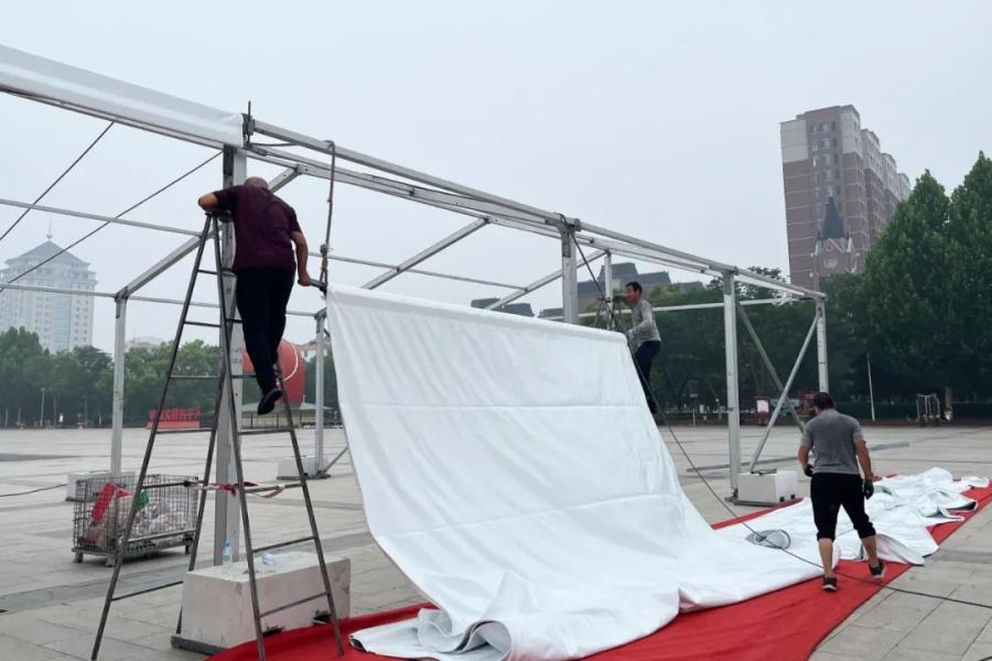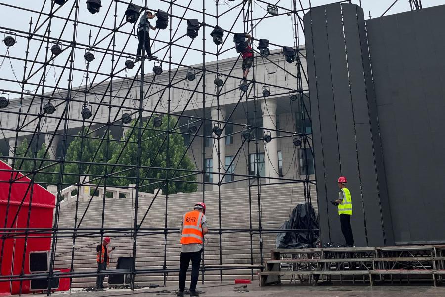 长子“村晚”舞台搭建在文化广场。7月16日,记者来到文化广场看到,宏大的“村晚”舞台主体已完成,工人们正在进行LED安装等工作。“为了确保舞台的稳定性和安全性,此次搭建采用了高品质的建筑材料,并严格按照设计图纸进行施工。目前,舞台的主体框架已经基本完成,接下来将进行灯光、音响等设备的安装和调试工作。”现场负责人刘朝海介绍,与此同时,“长子炒饼”、“长子理发”、“长子猪头肉”等技能大赛比赛篷房也在文化广场紧张搭建。