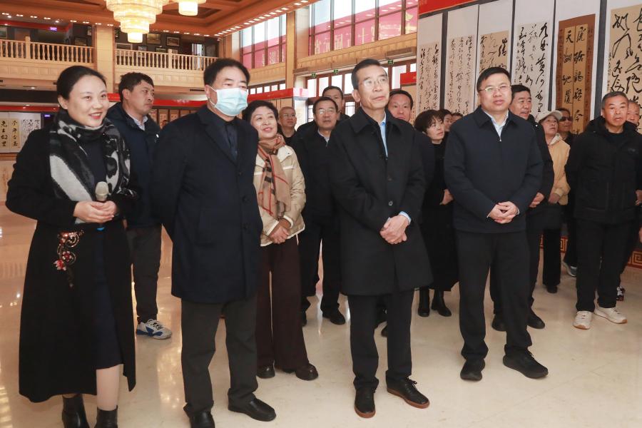 3月4日,县委书记牛志强,县委副书记、县长王慧忠等县领导在长子会堂大厅,参观2026年“六新长子”元宵节书画摄影展。