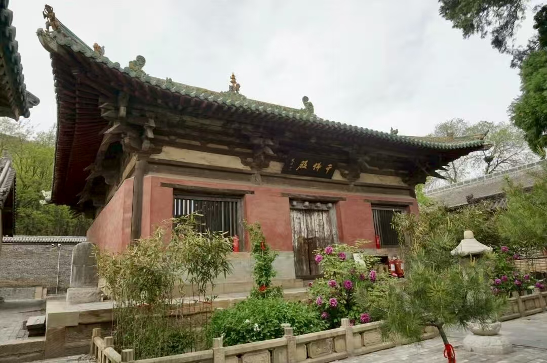 千佛殿是寺内主殿,为宋大中祥符九年(公元前1061年)兴建,殿内塑像亦是同时塑造。面宽三间,进深三间,六架椽屋,单檐九脊殿式屋顶(歇山顶),平面呈正方形。殿内梁架绝大多数构建为宋代原构,结架合理,制作规范。千佛殿梁架,即无虚设构件,亦无重复配置,技巧娴熟,手法洗练,负重均衡适度,结构合理有力,是我国宋代小型殿宇中具有代表性的遗作。殿顶琉璃色彩艳丽,造型生动,窗棂式样苍古,仍为宋人旧作。殿内佛坛束腰须弥式,束腰剔地突起雕花草纹,间柱上雕兽面,乃宋制无疑。