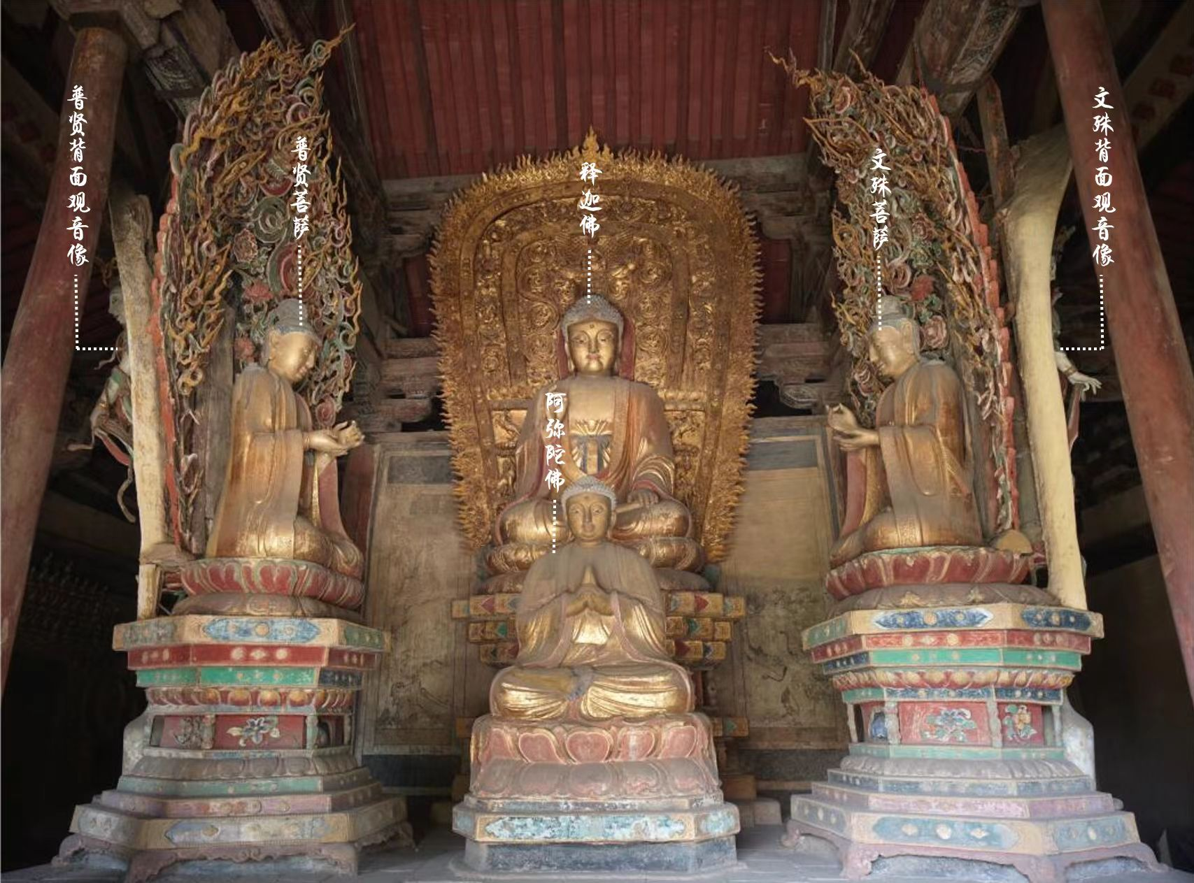 坛上供奉一佛二菩萨及背面侧座观音像,面相、衣饰、手法以及华丽无比的泥塑背光皆为明代雕塑特点,但彩塑的布列位置,躯体造型,头上发簪等,仍保留了宋代风格。