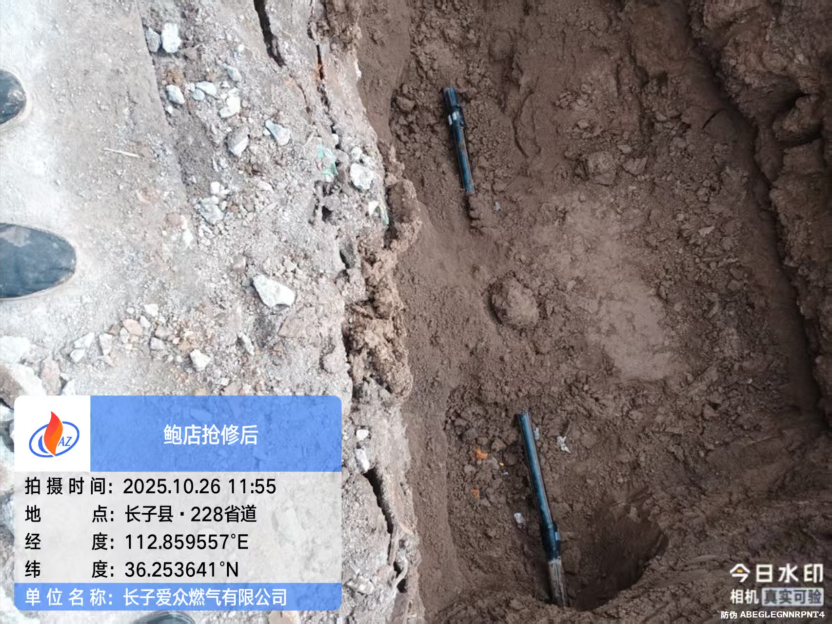 2025年10月26日,长子县爱众燃气有限公司位于鲍店镇南街村的燃气管道被第三方施工时挖断,公司接到通知后,立即前往事发现场,并采取应急措施,将控制该管道的所有阀门关闭,并于中午组织人员接通了燃气管道,在确保无安全隐患的前提下,逐步恢复正常供气,保证了广大用户安全、平稳、持续用气。
