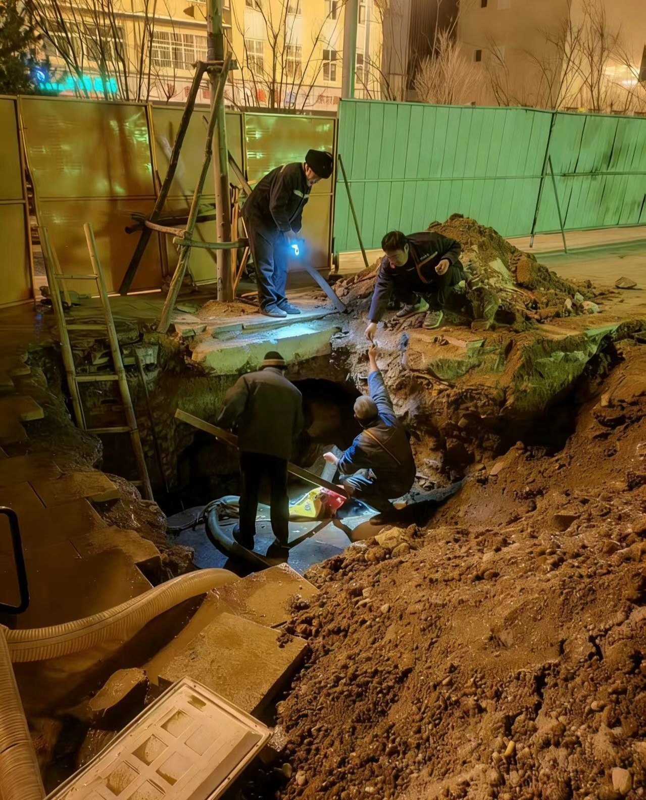 1月12日,府东小区东侧供热工程施工期间,不慎损坏一处∅160PE供水主管道,造成周边区域供水受影响。我集团接报后,第一时间启动应急抢修预案,迅速组织抢修人员、调配专业设备赶赴现场开展处置工作。抢修人员不畏严寒,高效完成阀门关停、积水排放、作业面开挖等前期准备,随即对破损管段实施紧急修复。经全体人员连续奋战,当日便完成管道更换与焊接作业,且通过加压测试合格,及时恢复正常供水。