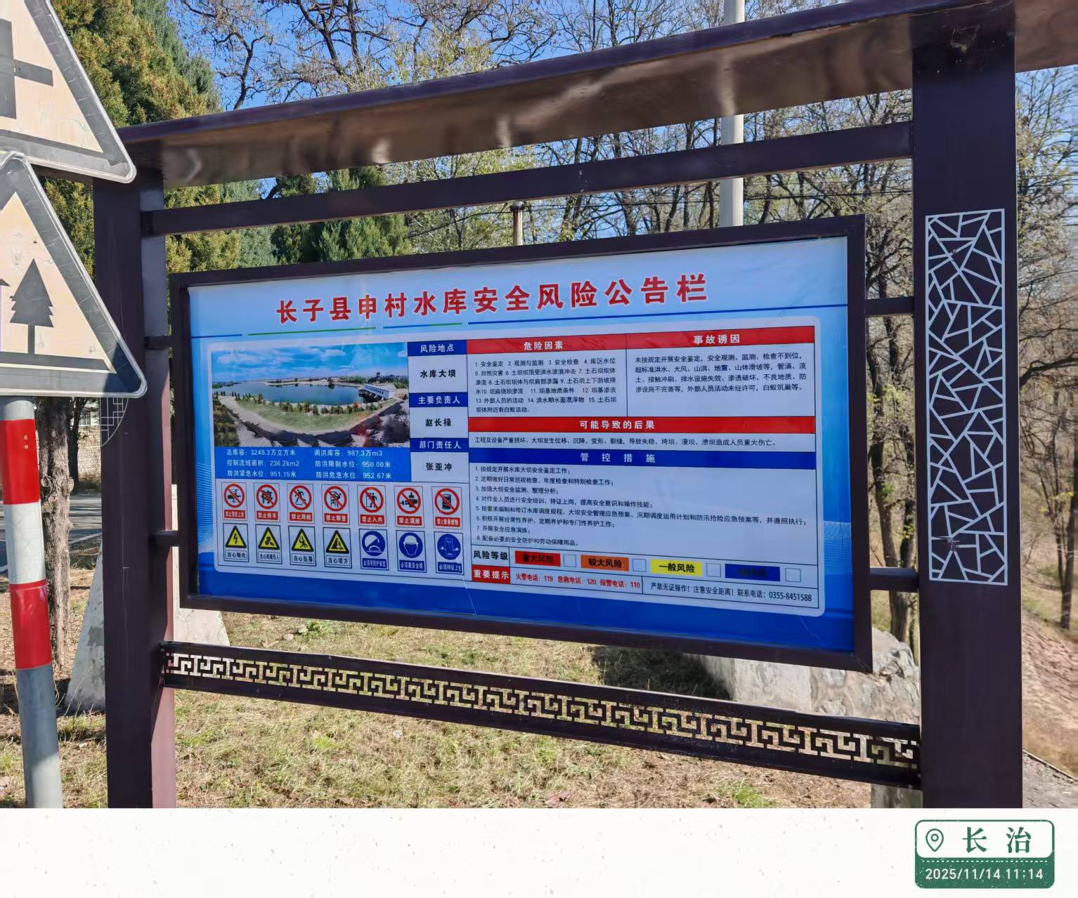 在申村水库设置安全风险公告栏,明确水库大坝的风险地点、危险因素、事故诱因及可能导致的工程损毁、人员伤亡等后果,同时公示主要负责人、部门责任人,确保风险责任可追溯。