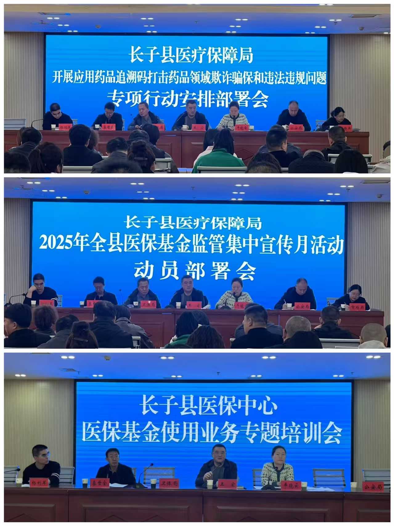 2025年4月22日上午,长子县医疗保障局召开了应用追溯码打击药品领域欺诈骗保和违法违规问题专项行动安排部署会、2025年医保基金监管集中宣传月活动动员部署会、医保基金使用业务专题培训会。医保局、中心领导及工作人员,县卫体局、公安局、市场监督管理局分管领导,各定点医药机构负责人及药剂科负责人共150余人参会。医保局局长王宏主持会议。