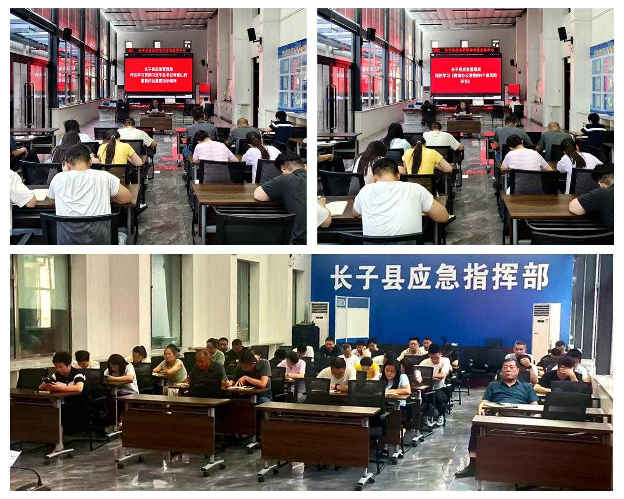 7月11日,长子县应急管理局组织全局干部职工在机关一楼会议室召开学习会议,集中传达学习习近平总书记考察山西重要讲话重要指示精神和《微信办公泄密的4个高风险环节》等。