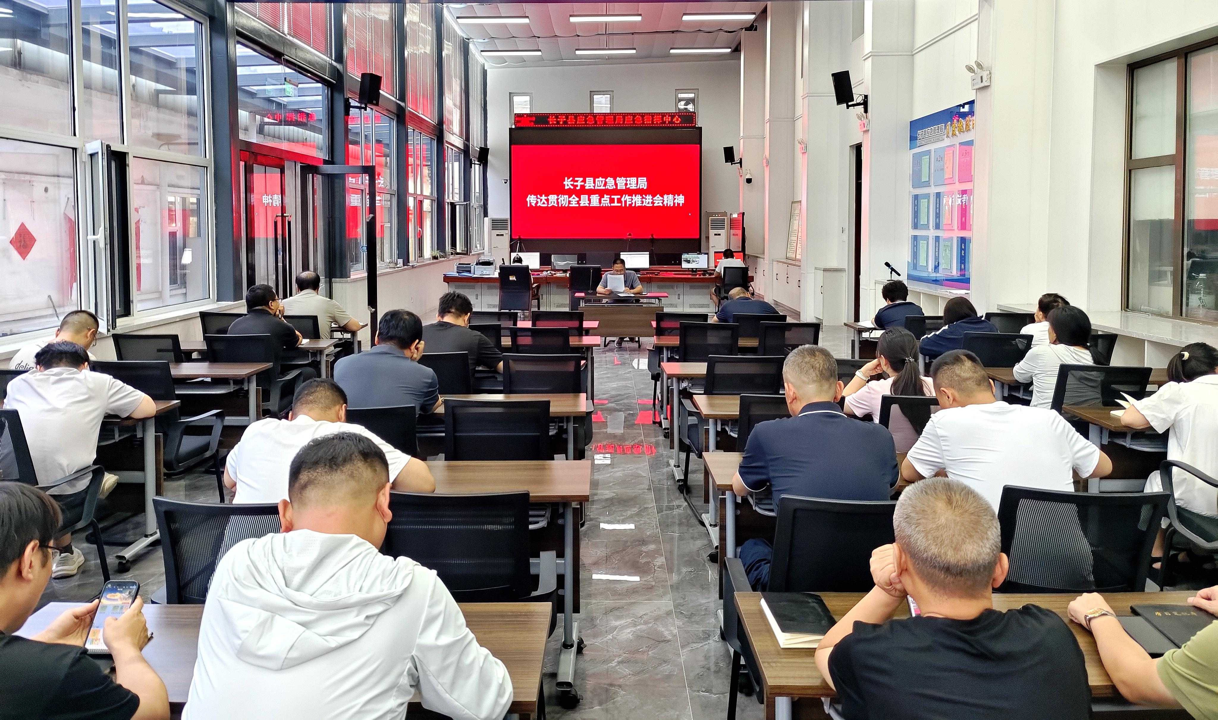8月1日,长子县应急管理局在机关一楼会议室召开传达贯彻全县重点工作推进会精神会议。