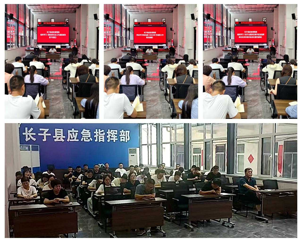8月8日,长子县应急管理局组织全局干部职工在机关一楼会议室召开学习会议,集中传达学习《整治形式主义为基层减负若干规定》《关于全国突发事件应急指挥综合业务系统内信息处置的通知》和长治市应急管理局《2025年7月值班工作情况通报》等。