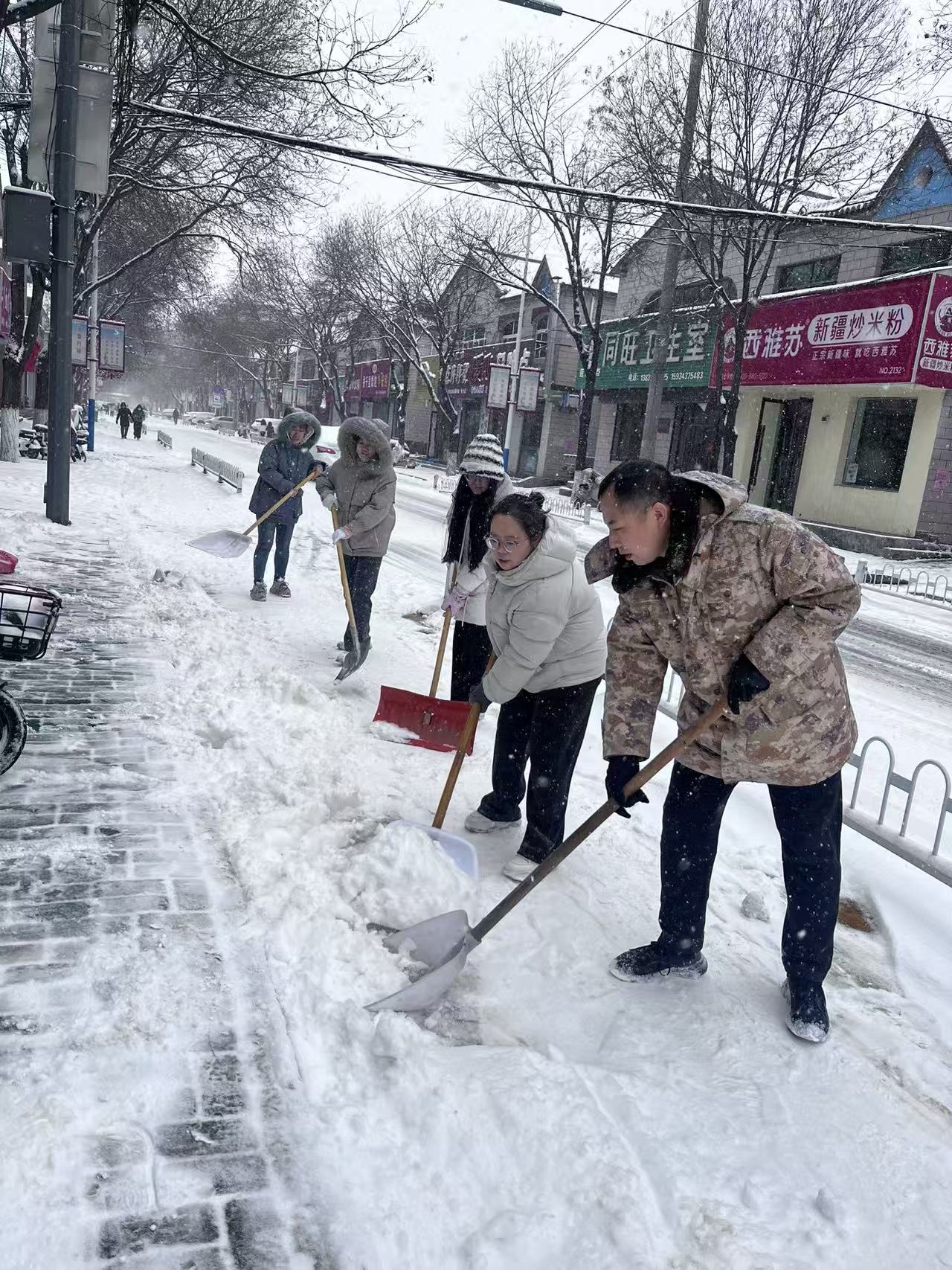 清雪过程中,党员干部手持铁锹、雪铲等工具,不畏凛冽寒风,分工协作,齐心协力对道路积雪积冰进行全面清理。大家热情高涨、干劲十足,为行人与非机动车提供了安全通行条件。