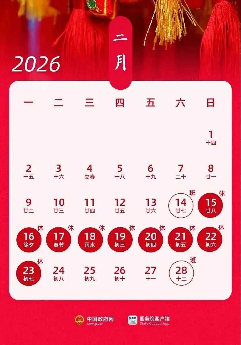 2026年春节放假时间: