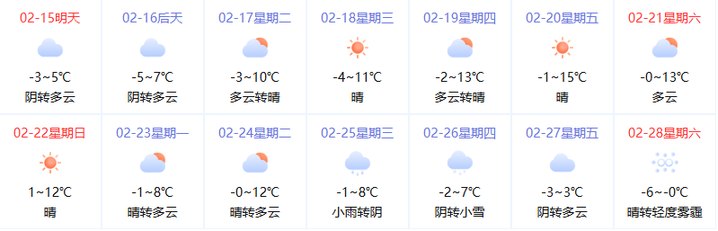 2月15日(腊月二十八)可能会出现降雪天气,假期中后期以晴间多云天气为主,请各位驾驶员出行前请提前了解天气情况,并仔细检查车辆车况。