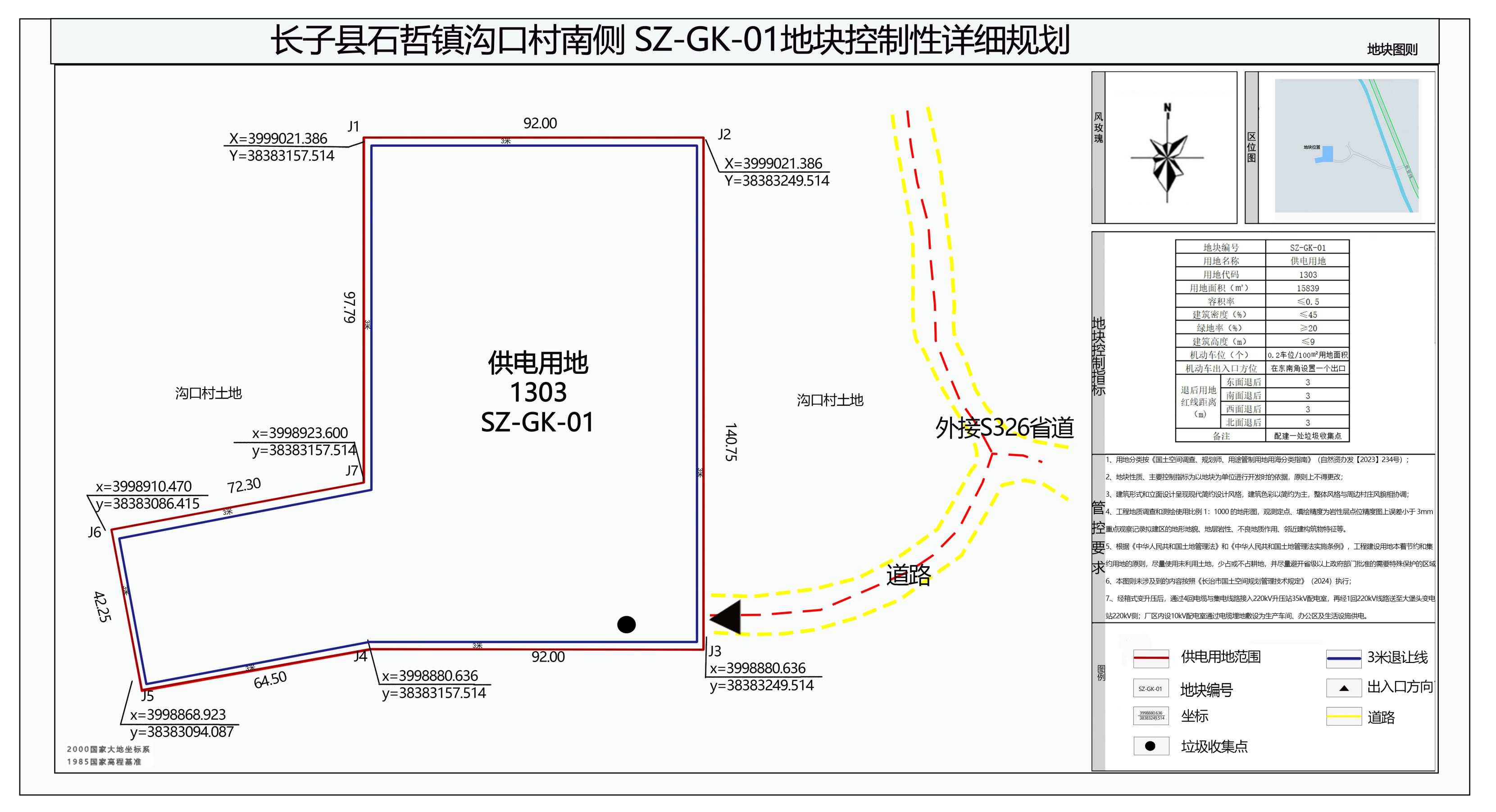 本次规划地块位于长子县石哲镇沟口村南侧,S326省道西侧,占地1.5839公顷(合23.76亩),太(原)—焦(作)铁路、省道S227长(治)—晋(城)公路等交通干线距离地块有一定距离但是周边有S326省道对外交通便利,结合地块周边道路及交通流量现状,拟定于地块东南角处,沿现有乡间小路与S326省道衔接(乡间道路宽度为9米),设置单一进出混合型出入口。车辆由地块驶出时,需经由该出入口沿乡间小路缓速行驶,汇入S326省道;由省道方向驶入地块的车辆,则通过乡间小路经此出入口进入地块。规划区域总用地面积1.5839公顷(合23.76亩)。