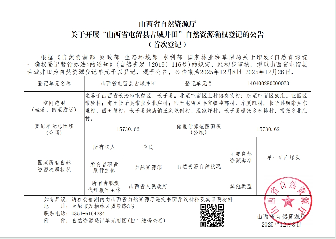 标题山西省自然资源厅关于开展“山西省屯留县古城井田”自然资源确权登记的公告(首次登记)