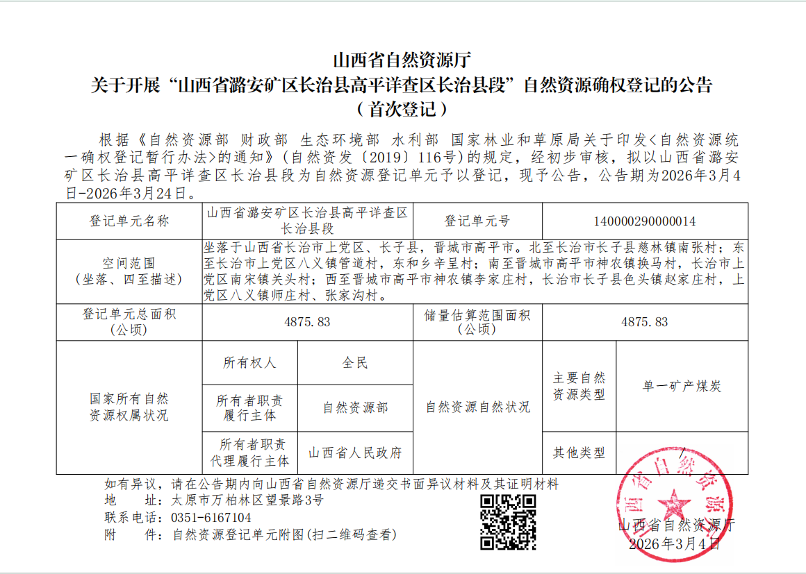 标题山西省自然资源厅关于开展“山西省潞安矿区长治县高平详查区长治县段”自然资源确权登记的公告(首次登记)