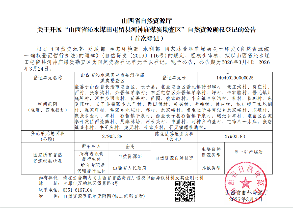 标题山西省自然资源厅关于开展“山西省沁水煤田屯留县河神庙煤炭勘查区”自然资源确权登记的公告(首次登记)