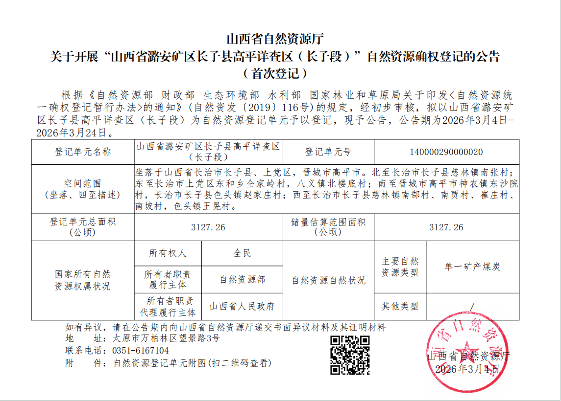 标题山西省自然资源厅关于开展“山西省潞安矿区长子县高平详查区(长子段)”自然资源确权登记的公告(首次登记)