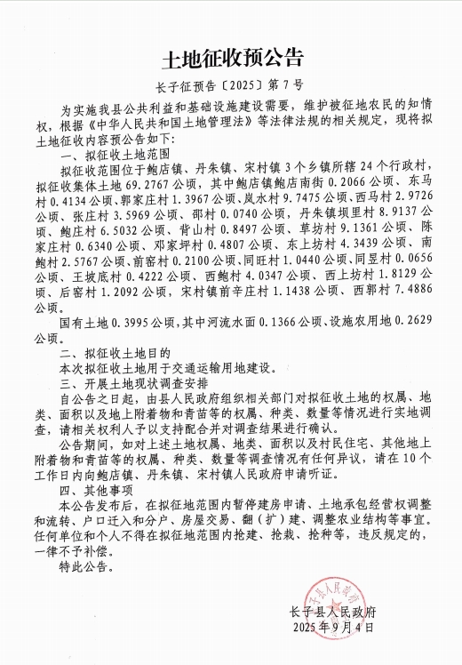 标题长子县人民政府土地征收预公告〔2025〕第7号