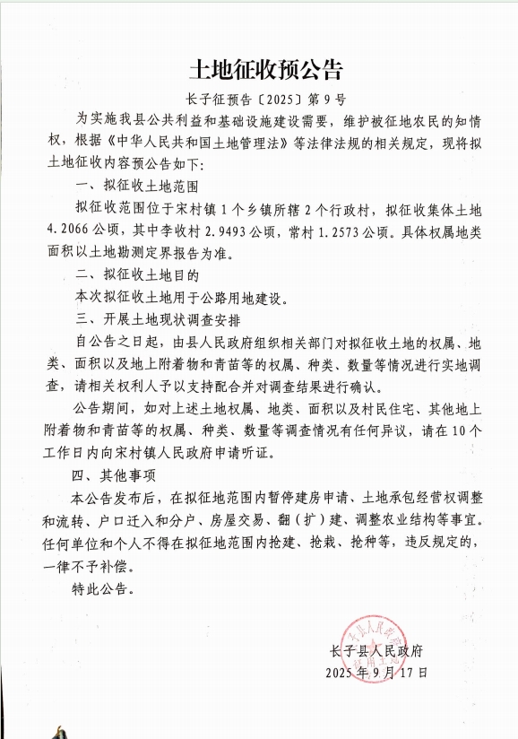 标题长子县人民政府土地征收预公告〔2025〕第9号