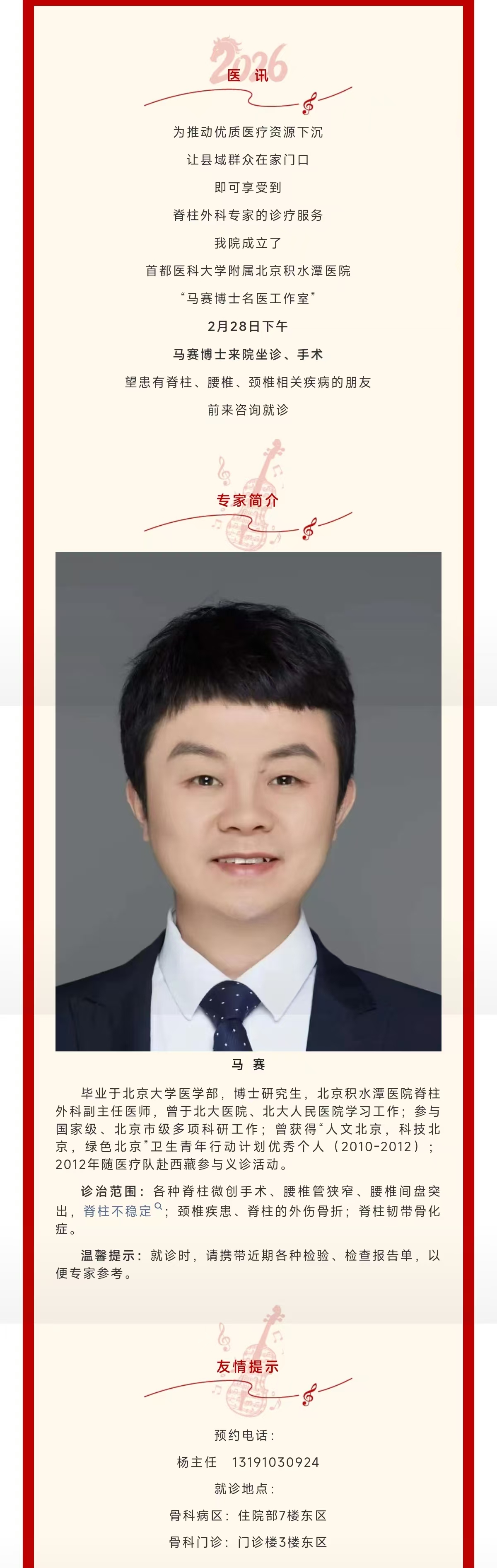 标题北京积水潭医院马赛博士2月28日下午来长子县人民医院名医工作室坐诊手术