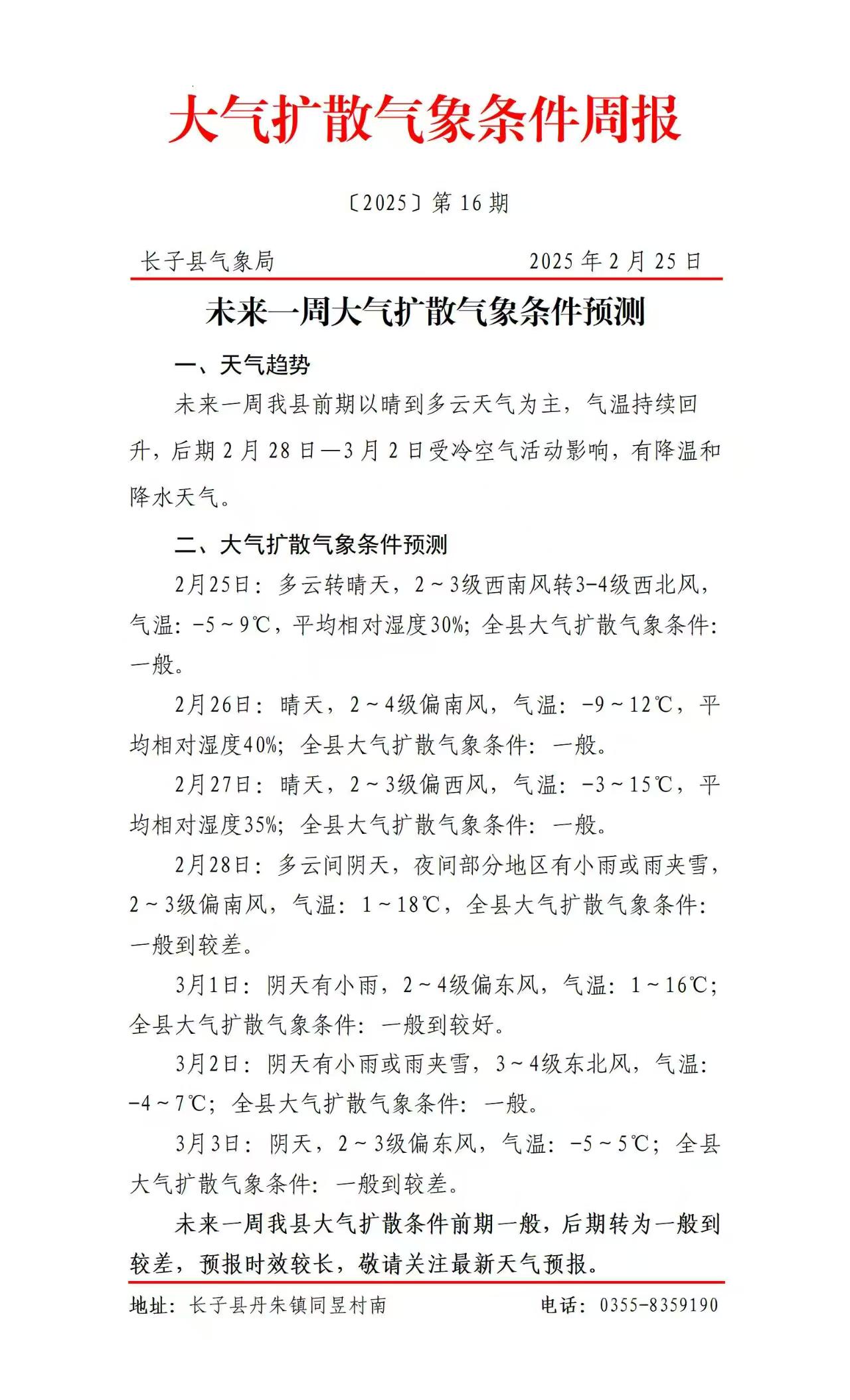 标题王峪景区服务中心转发长子县气象局大气扩散气象条件周报