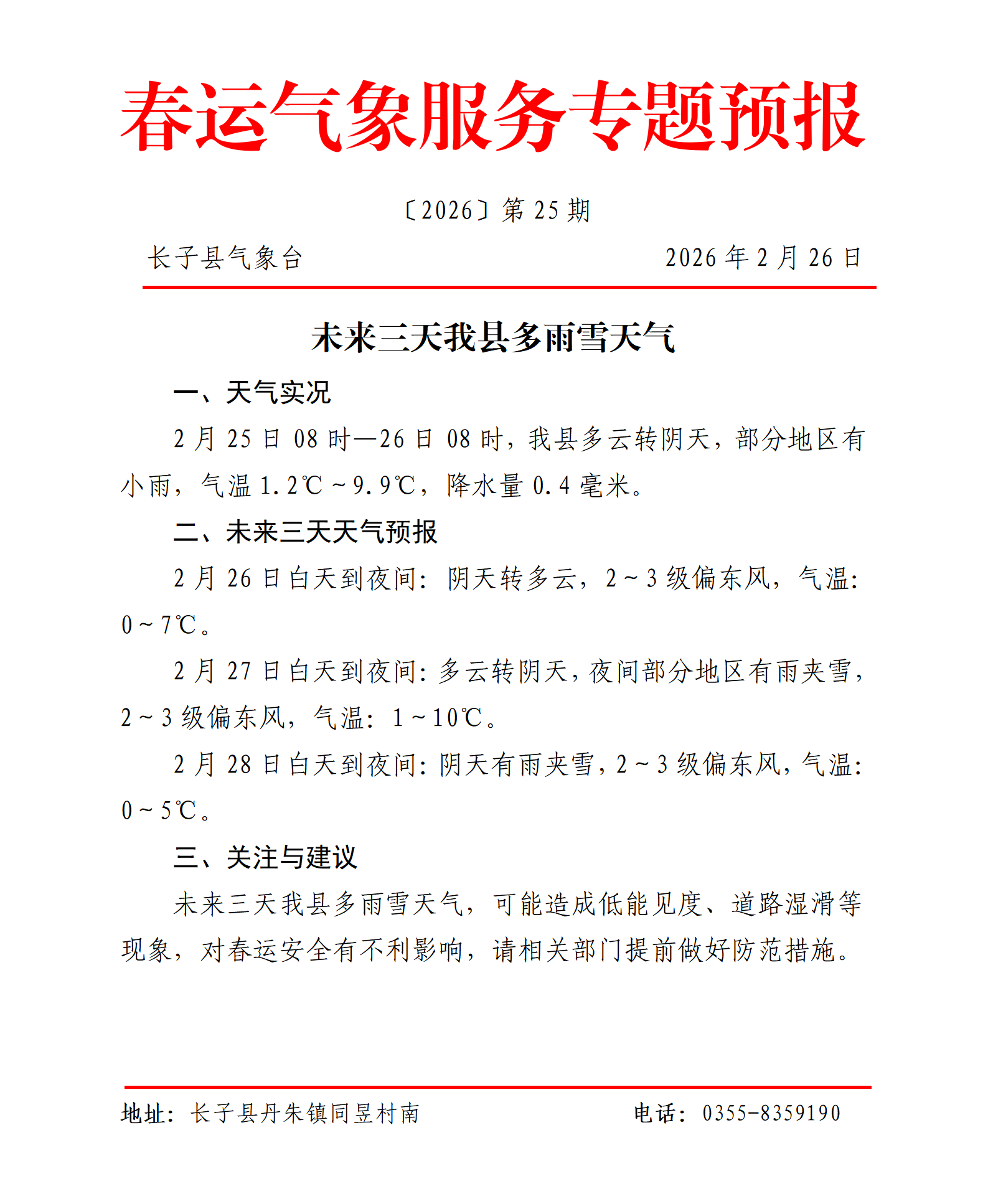 标题王峪景区服务中心转发长子县气象台春运气象服务专题预报