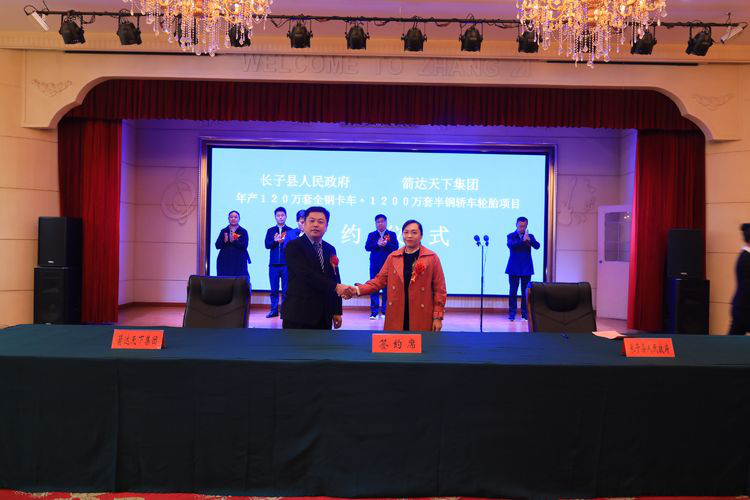 10月12日,年产120万套全钢卡车、1200万套半钢轿车子午线轮胎项目签约仪式在县宾馆宴会厅举行,箭达天下集团董事长陈志伟,县委副书记、县长赵永进,县委常委、常务副县长史宇荣,副县长胡红星参加签约仪式。宋村乡、发改局、自然资源局、生态环境局、行政审批局、应急局等部门负责人参会。