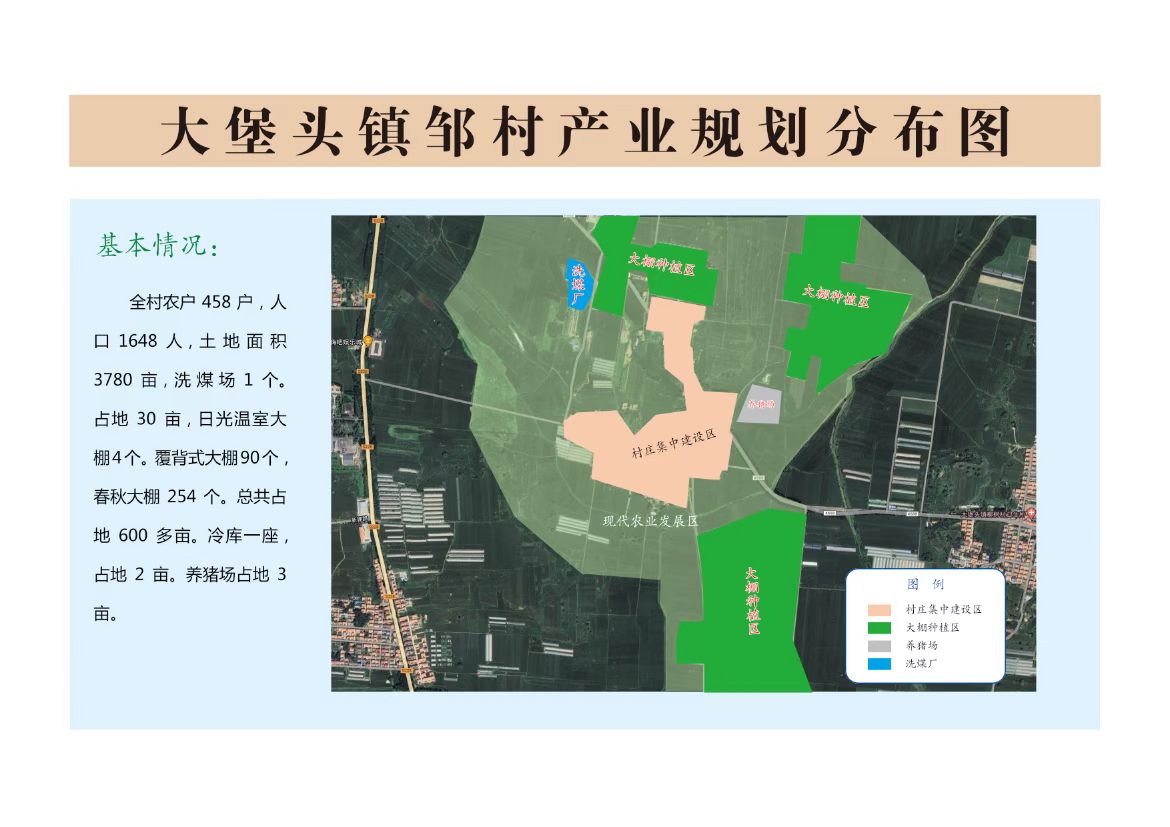 全村农户458户,人口1648人,土地面积3780亩,洗煤场1个。占地 30亩,日光温室大棚4个。覆被式大棚90个,春秋大棚 254个。总共占地 600 多亩。冷库一座,占地 2 亩。养猪场占地3亩。
