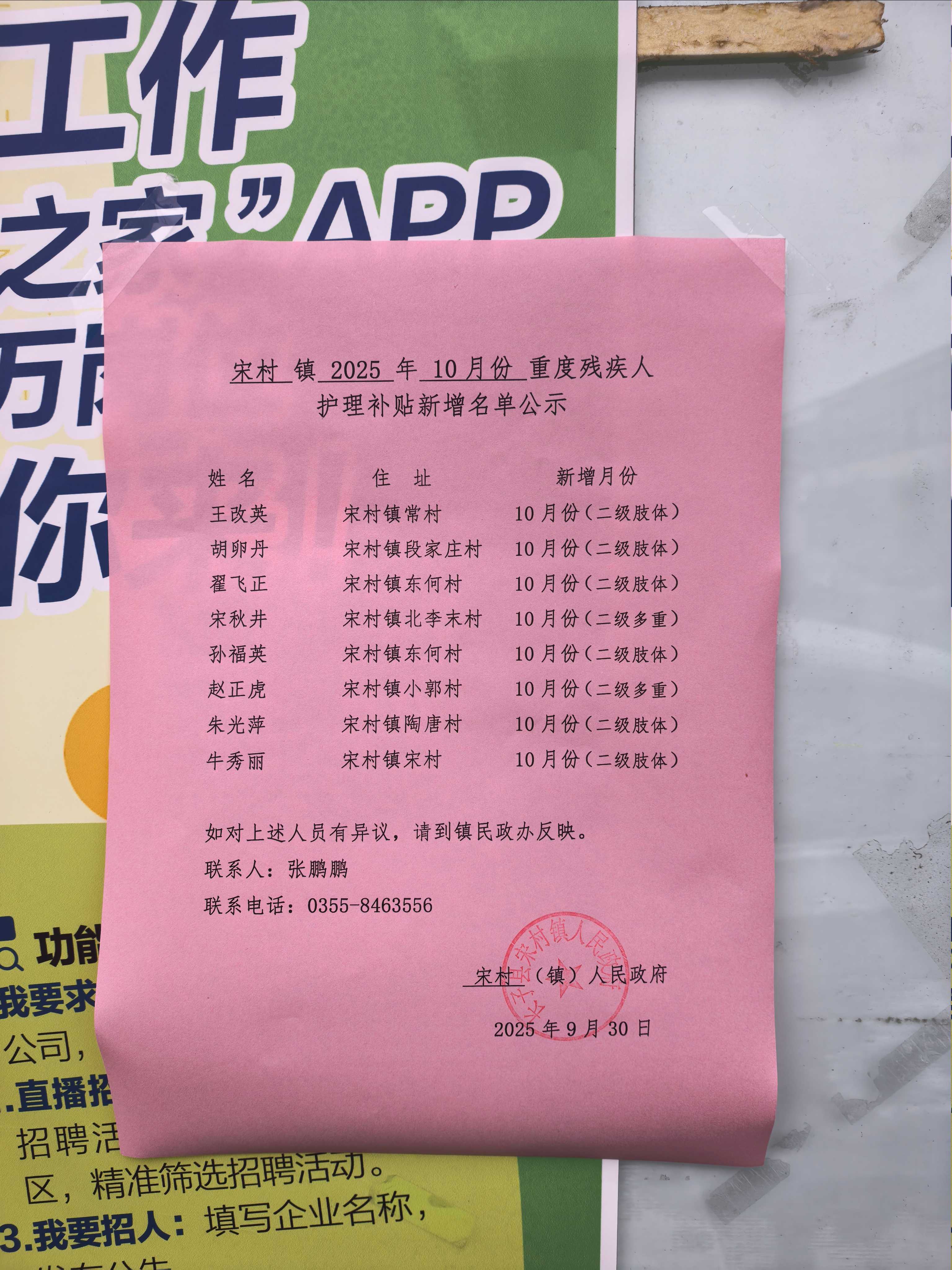 标题宋村镇2025年10月份重度残疾人护理补贴新增名单公示