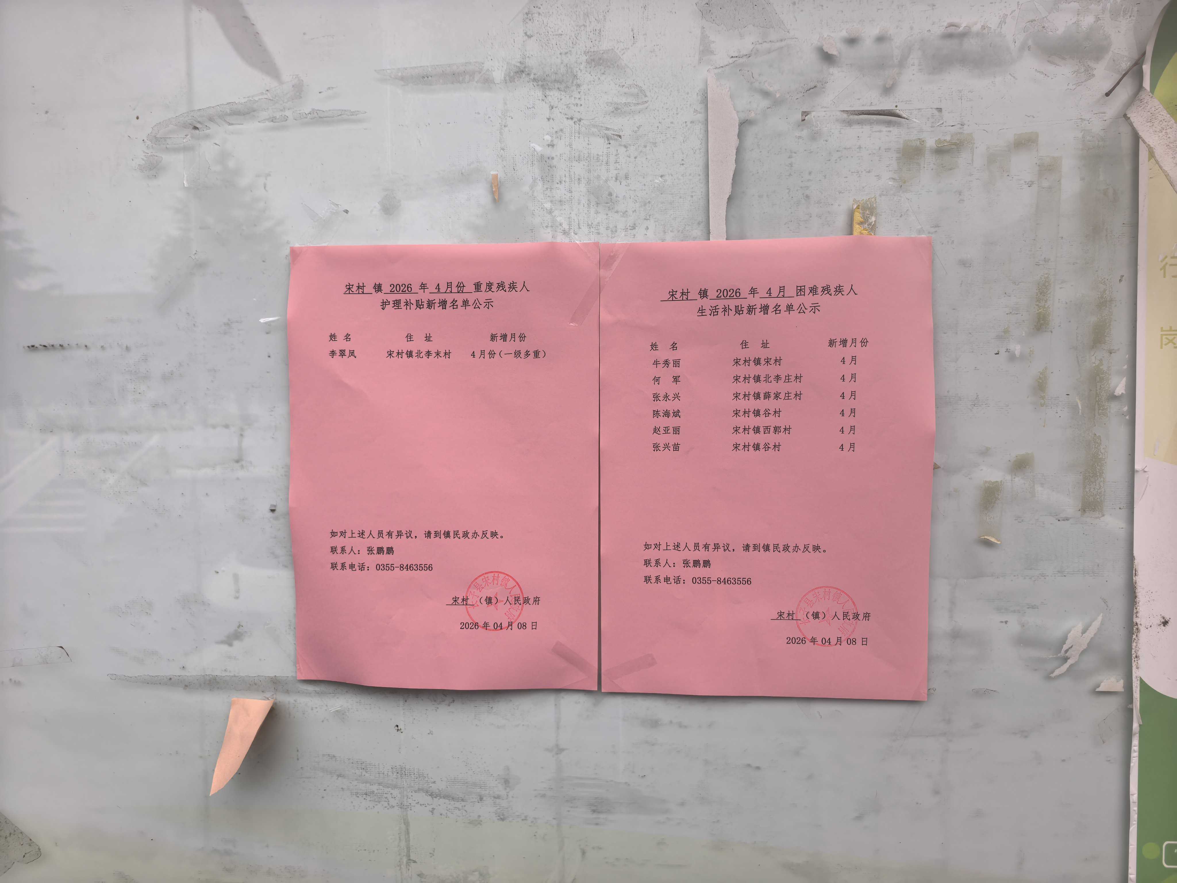 标题宋村镇2026年4月困难残疾人生活补贴新增名单公示