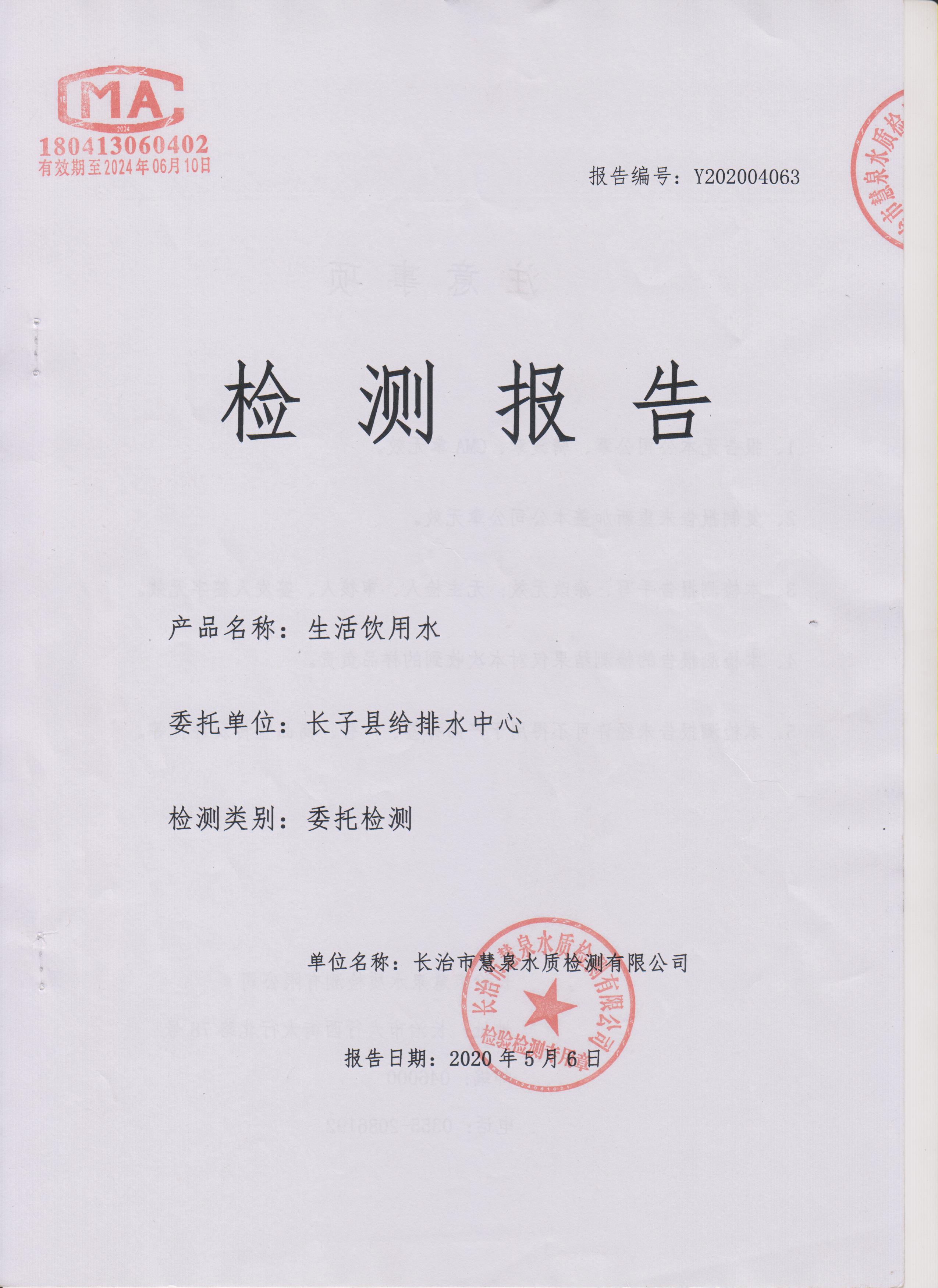 标题长子县给排水中心生活饮用水检测报告