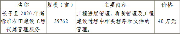 | 标题:长子县2020年高标准农田建设工程代建管理服务采购公告 | |