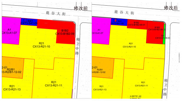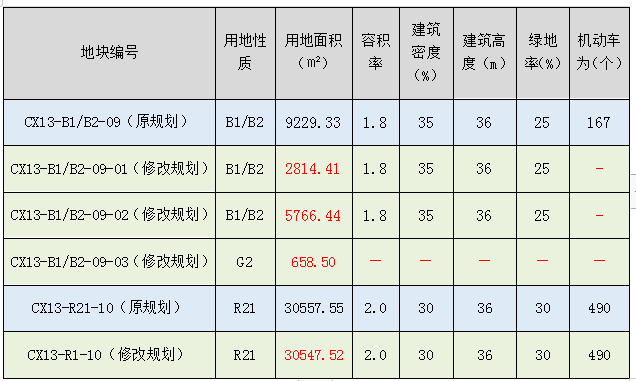 依据国有土地批地范围,对本次该项目商住用地CX-B1/B2-09地块进行分割,由原CX13-B1/B2-09地块划分为CX13-B1/B2-09-01、CX13-B1/B2-09-02与CX13-G2-09-03三地块。划分后CX13-B1/B2-09-01、CX13-B1/B2-09-02为商业/商务用地(B1/B2),容积率控制为1.8,建筑密度控制为35%,建筑高度控制为36m,绿地率控制为25%;CX13-G2-09-03地块为公共绿地(G1)。