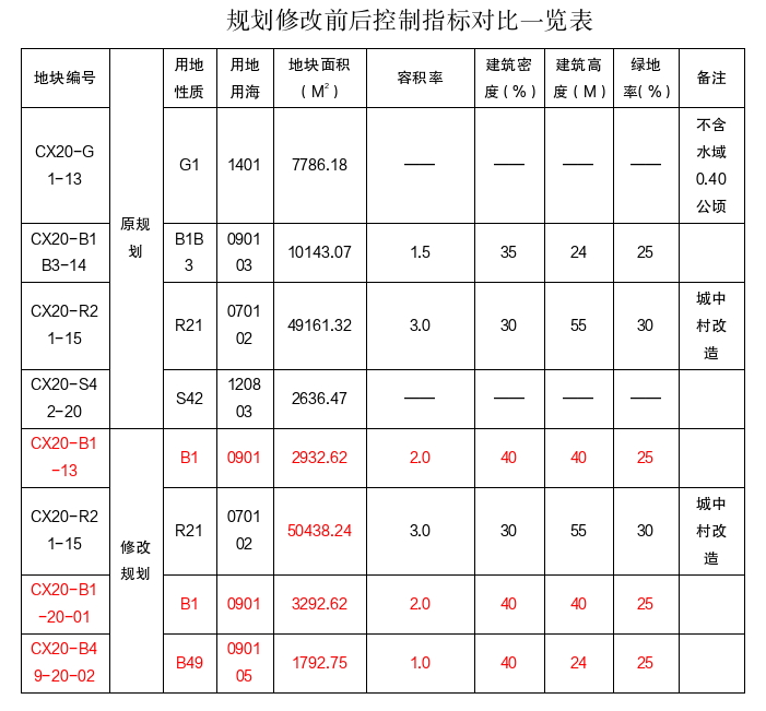 1、用地范围:根据城镇开发边界对用地范围进行修改,原CX20-G1-13~CX20-R21-15、CX20-R22-19、CX20-S42-20地块用地面积76856.58㎡,修改后用地面积为58456.23㎡。