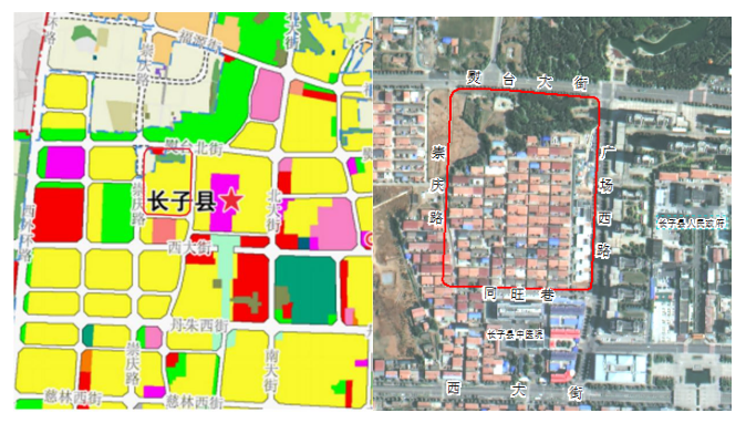 本次规划修改地块位于《长子县城西片区控制性详细规划》CX20街坊。北侧紧邻熨台大街、南侧紧邻同旺巷、西侧紧邻崇庆路、东侧紧邻广场西路,规划用地总面积76856.58㎡。