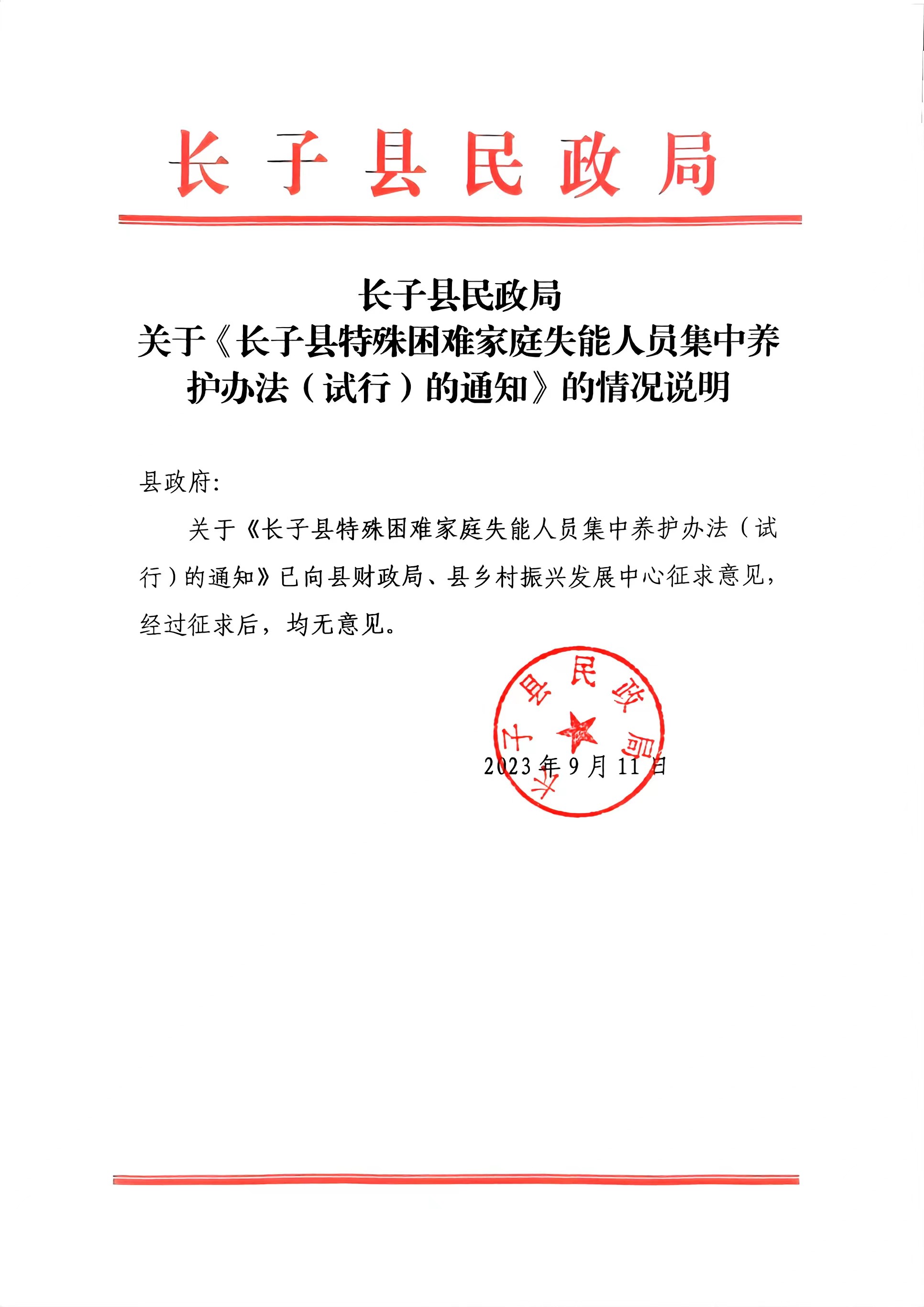 标题关于对《长子县特殊困难家庭失能人员集中养护办法(试行)的通知》的情况说明(征求意见)