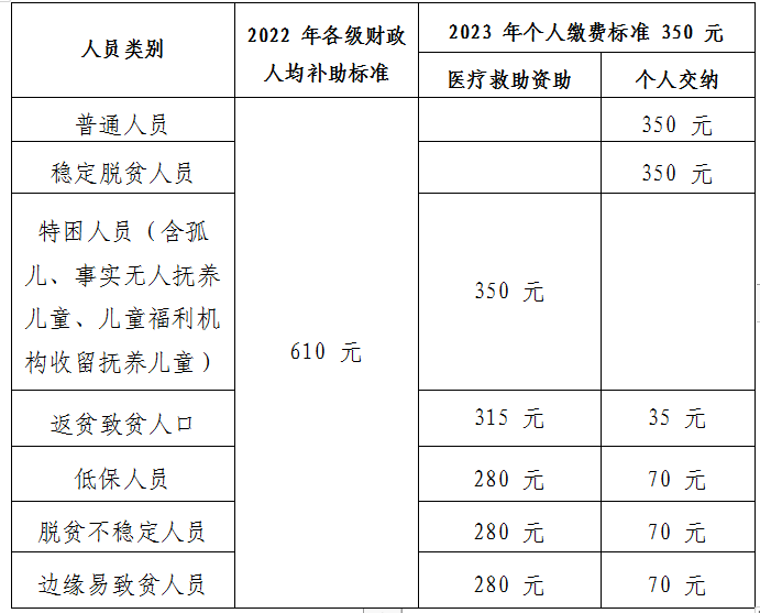 2022年预收2023年度城乡居民基本医疗保险个人缴费标准为350元,各级财政补助标准为人均610元。对特殊人群实行分类资助,资助标准及资金来源如下:
