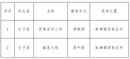 为贯彻落实住房和城乡建设部办公厅《关于进一步加强历史文化街区划定和历史建筑确定工作的通知》(建办规函(2017) 270号)精神,加强对我县具有一定历史、科学、艺术等价值的历史建筑保护,更好地传承历史文化,保留历史记忆,彰显地域特色,根据历史建筑普查公布程序,经研究,确定南漳镇西南呈村村公所、崔家大院2处历史建筑为长子县第一批历史建筑,现将名单予以公布。