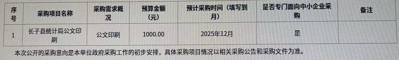 为便于供应商及时了解政府采购信息,根据《财政部关于开展政府采购意向公开工作的通知》(财库〔2020〕10号)等有关规定,现将长子县统计局2025年11月至12月采购意向公开如下: